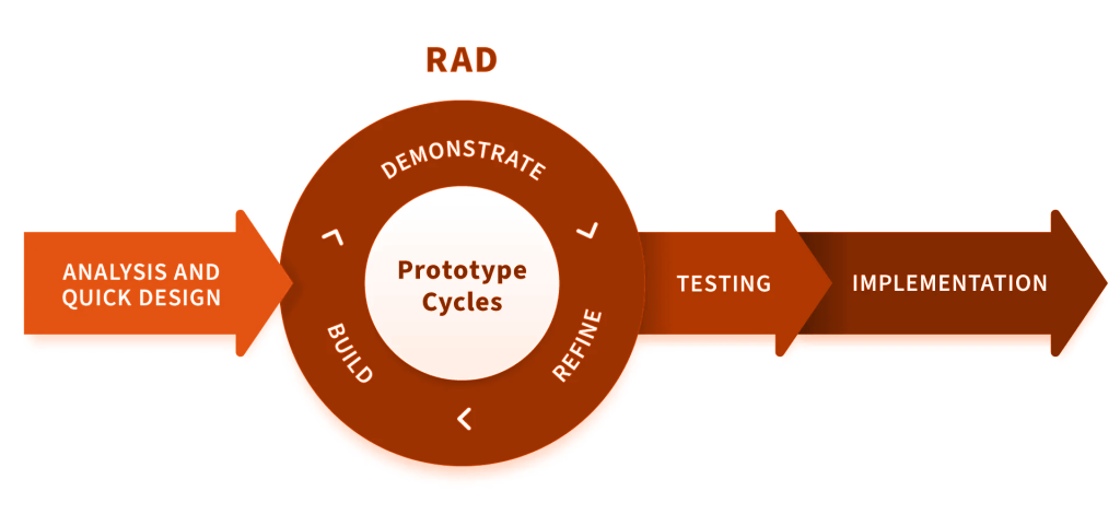 RAD emphasizes quick prototyping and iterative development with continuous user feedback. Instead of following a rigid plan, RAD focuses on adaptability and speed, making it ideal for projects requiring fast turnarounds and frequent updates. It reduces risks and enhances software usability.