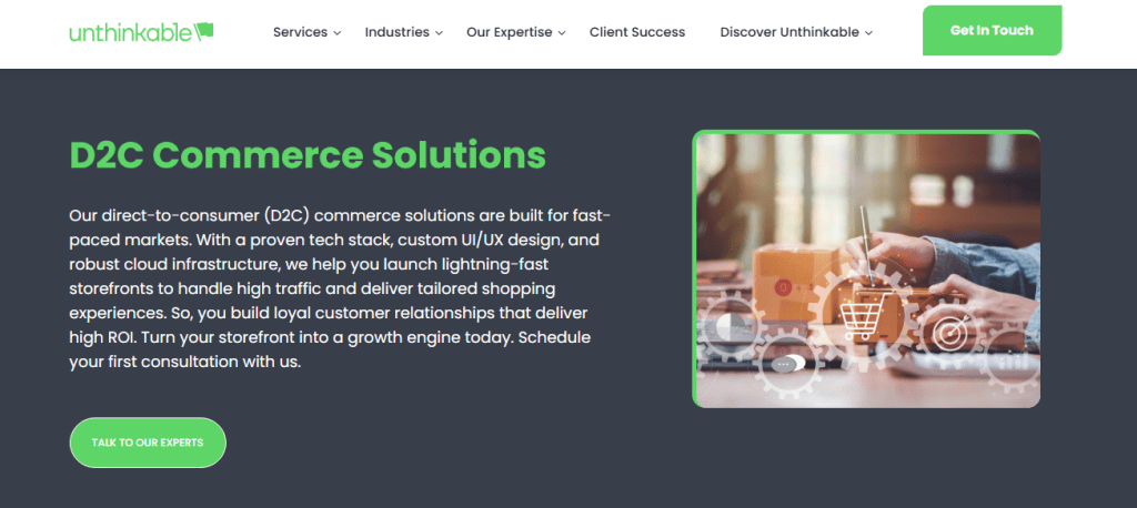 Unthinkable Solutions positions D2C commerce as a full growth system rather than a simple online store. The platform support goes deep into product discovery, cloud scalability, and data-led personalization, making it suitable for brands that expect rapid traffic spikes and complex customer journeys.