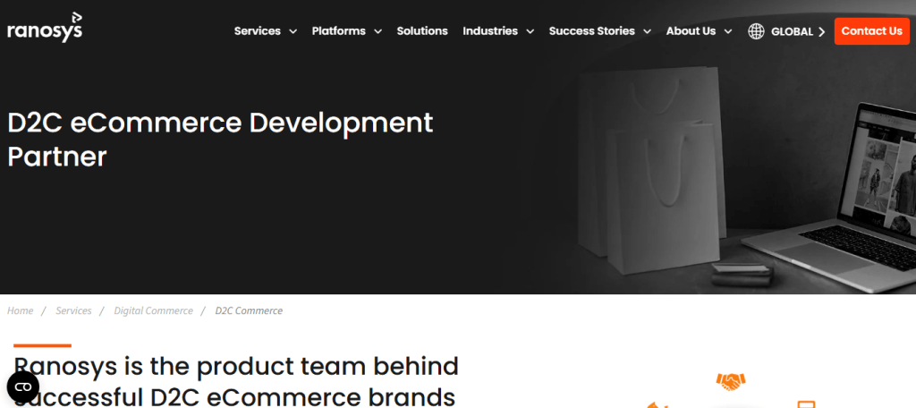 Ranosys helps D2C brands in the US build and scale direct-to-consumer eCommerce platforms. The company works with businesses that want to launch new D2C stores or improve existing ones. Ranosys focuses on platform-based development using Adobe Commerce, Salesforce Commerce Cloud, and Shopify Plus.