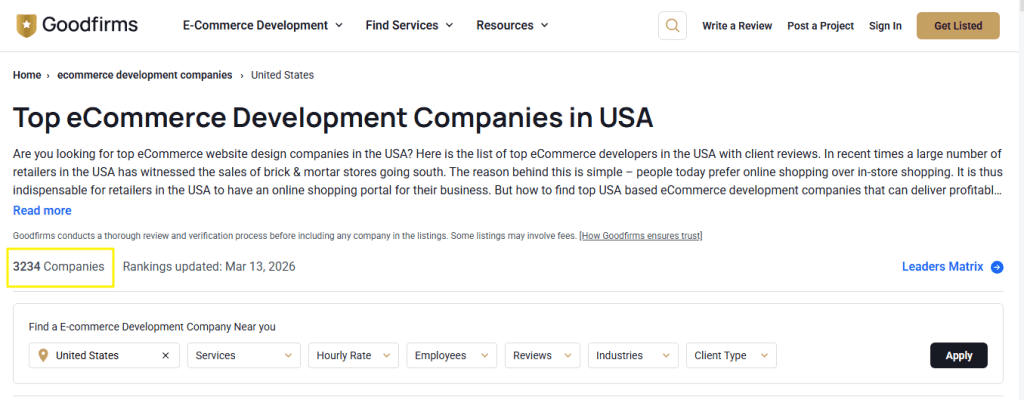 However, when you explore directories such as Clutch, GoodFirms, and G2, you will notice that hundreds of companies in the United States offer eCommerce development services. With so many similar providers, identifying the right partner can become difficult.