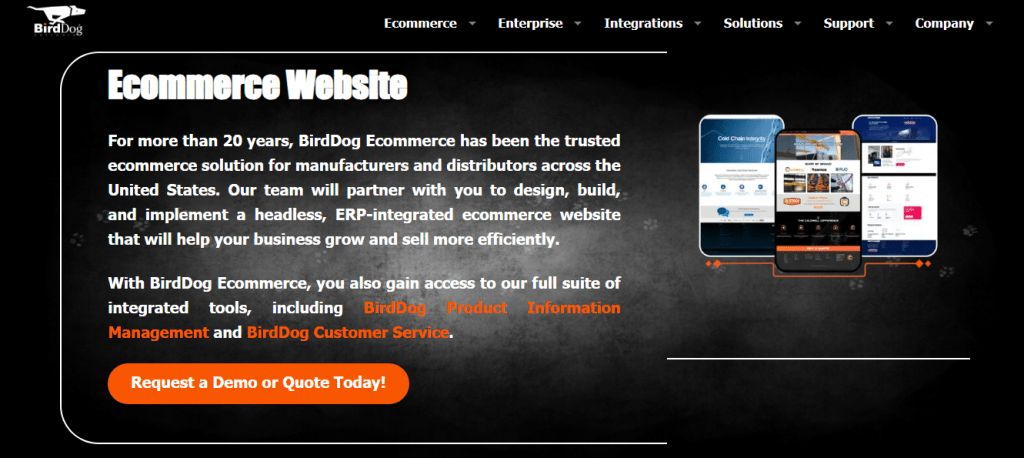 BirdDog Software focuses on D2C ecommerce from an operations-first angle, making it a strong fit for manufacturers and distributors selling directly to end customers. Instead of starting with storefront design, BirdDog builds around ERP integration, product data control, and order workflows.