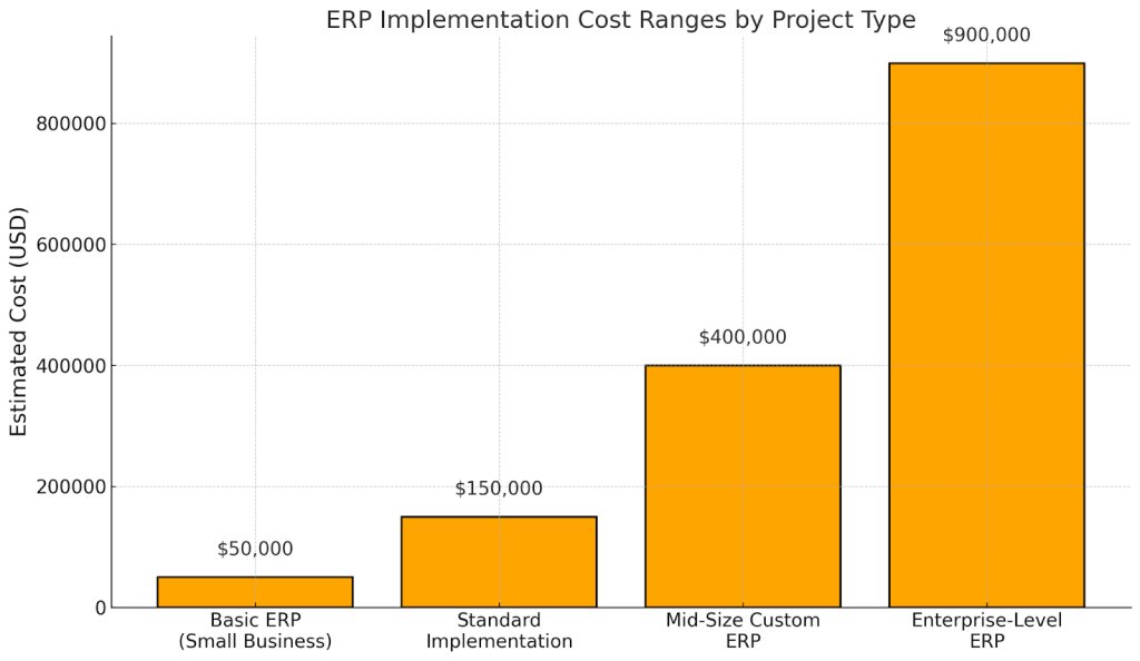 | Advanced ERP for growing companies | $250,000 to $600,000 | Multiple modules, automation, mobile access, complex data migration, and several integrations |