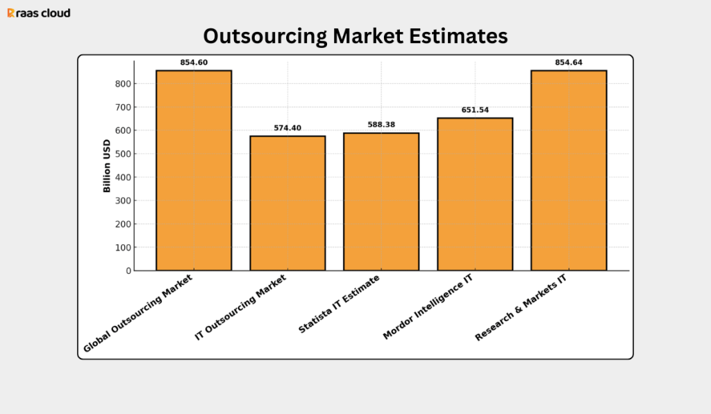 - Research and Markets estimates a 2025 value of 854.64 billion dollars for the broader outsourcing sector.