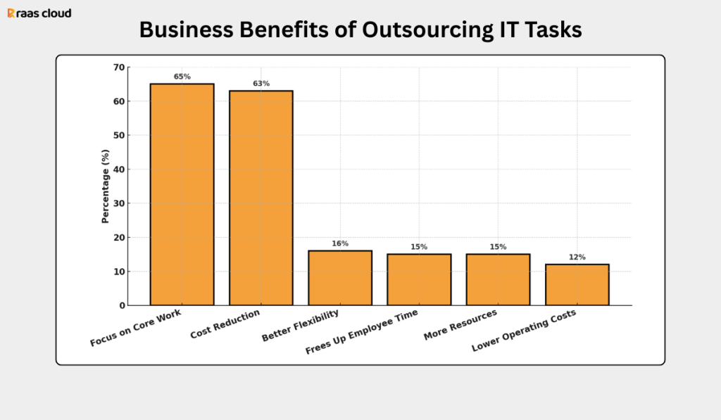 - 65% of companies say outsourcing helps them focus on their core work because outside teams handle time-consuming IT tasks.
