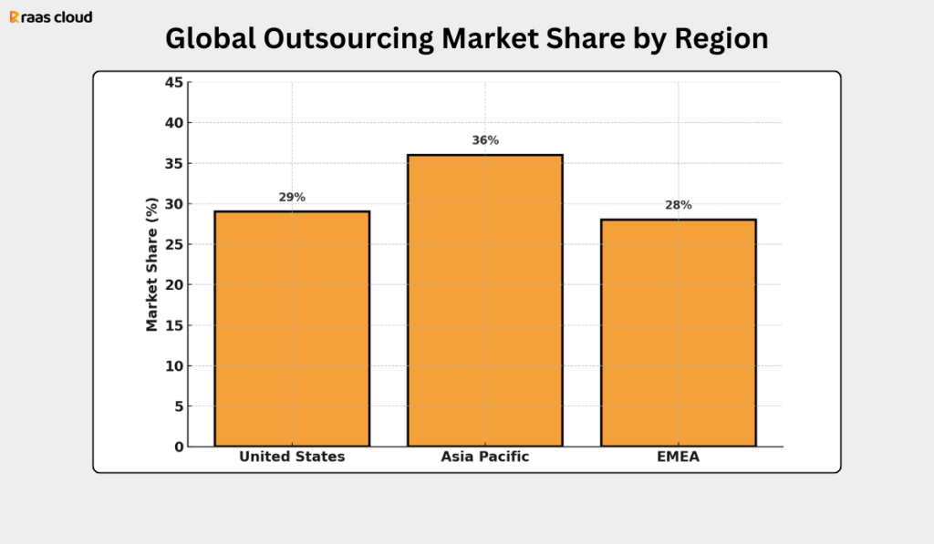- The Asia Pacific region leads global outsourcing growth and holds 36% of the worldwide market due to large and skilled talent pools.