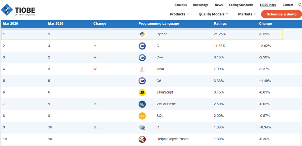 Demand for Python development shows no signs of slowing down. Data from the TIOBE Index shows that Python ranks as the most popular programming language in 2026 with a rating of 21.25%. This strong position reflects how widely companies use Python for web development, backend systems, data engineering, automation, and AI applications.