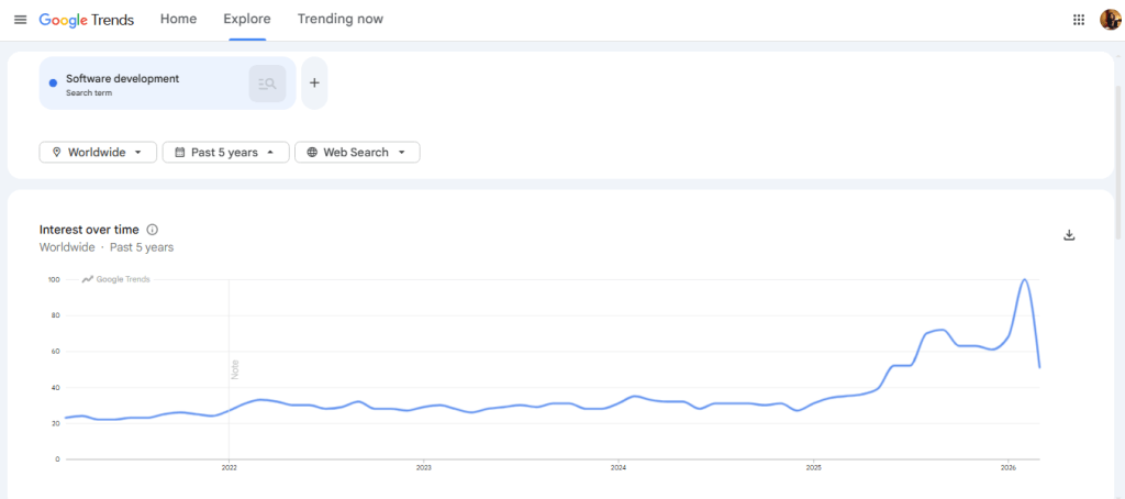 Google Trends data from the last five years for software development services shows steady growth in interest. It reflects how companies are prioritizing custom applications, SaaS platforms, cloud systems, and AI-driven solutions.