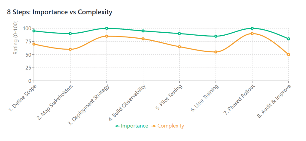 This phase closes the learning loop. Documented insights reduce repeat errors, strengthen future rollout efficiency, and demonstrate tangible ROI from the implementation effort.