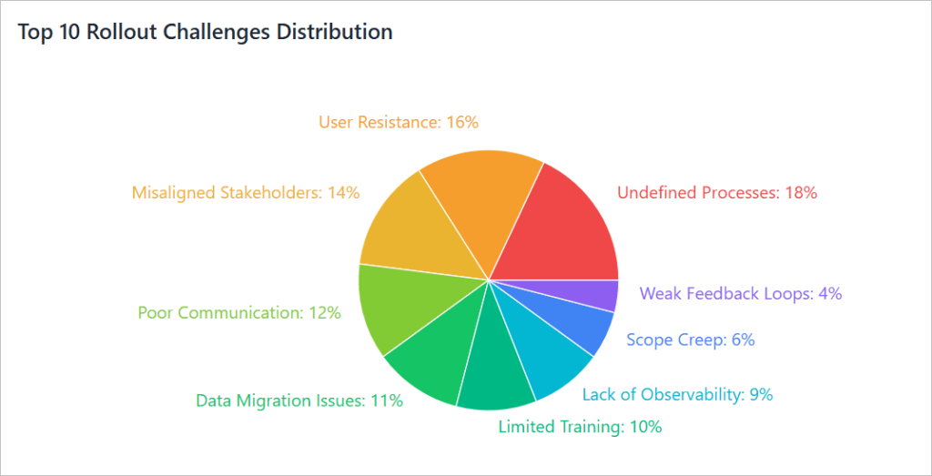 Most rollout failures stem from unclear ownership, poor adoption planning, and missing rollback safeguards.